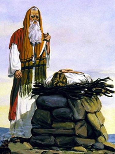Os dois continuaram a subir. No cimo da montanha, Abraão construiu um altar em pedra e deitou sobre este a lenha. Subitamente, agarrou Isaac com violência, amarrou-o e deitou-o em cima do altar. Levantou a sua faca. “Abraão” – chamou Deus.