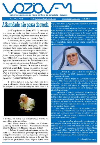 Com o mês de Maio na sua parte final, aí está o Boletim Paroquial Voz Jovem, com as informações habituais do movimento próprio da comunidade Paroquial. Neste mês de Maio destacámos a SANTIDADE, no Editorial, salientando as duas beatificações realizadas de importância para a Igreja e para o mundo, uima mais global que outra: a beatificação de João Paulo II, já do nosso tempo, pois morreu a 2 de abril de 2005, e foi beaticado pelo Papa Bento XVI, no Vaticano, no passado dia 1 de Maio, e a beatificação de Madre Clara de Jesus, do nosso Portugal, beatificada no dia 21 de Maio, no Estádio de Futebol do restelo, em Lisboa.